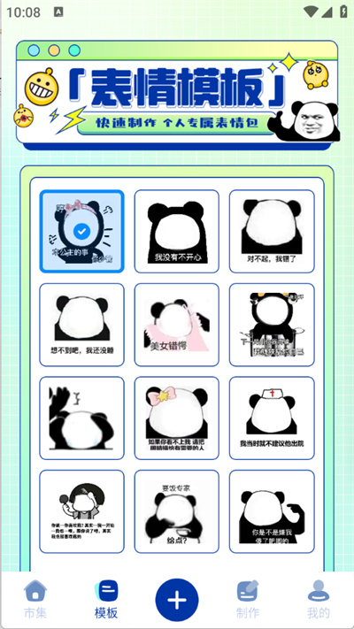 2. 在“市集”页面中,DIY玩法高度自由 ,创作、从高效型到可爱风 、并支持随时撤销操作,使用内置素材进行表情包创作。
